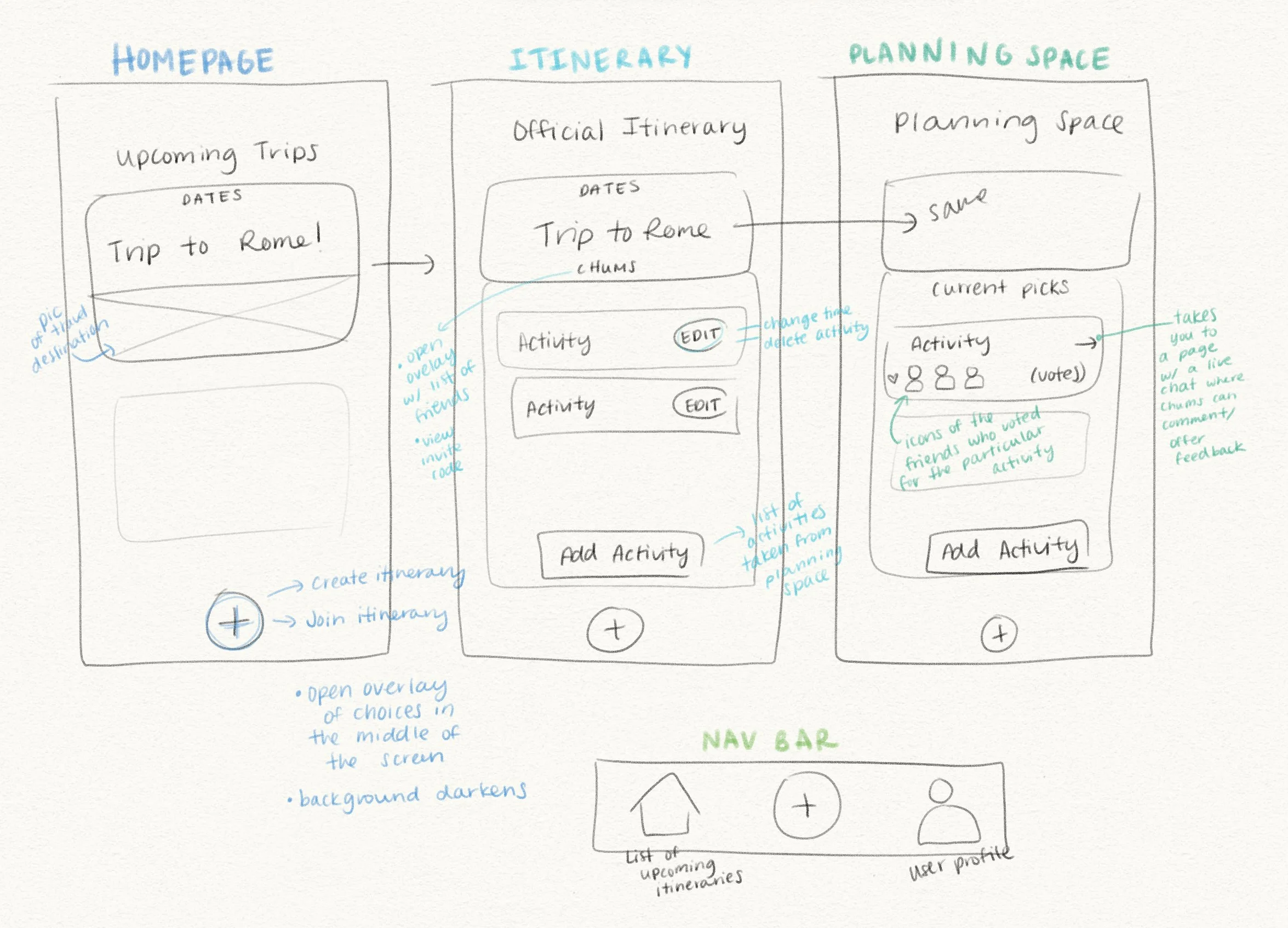 After collecting all the data, I needed to begin creating some structure to organize my ideas for the app. I sketched out a task flow for creating an account, joining an itinerary, and modifying it. This process aided in clarifying the foundational user flow, which I would later design.